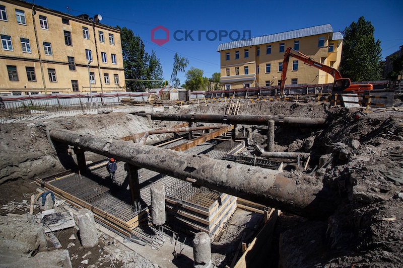 - Ввиду особенностей характеристик грунта проект предусматривал монтаж распорных труб длиной более 30 м, которые невозможно выполнить без опирания. Однако из-за ограничений по вибронагрузкам на окружающую застройку, вместо типового опирания на стойки-трубы выполнялось опирание на группу свай по нестандартным узлам.