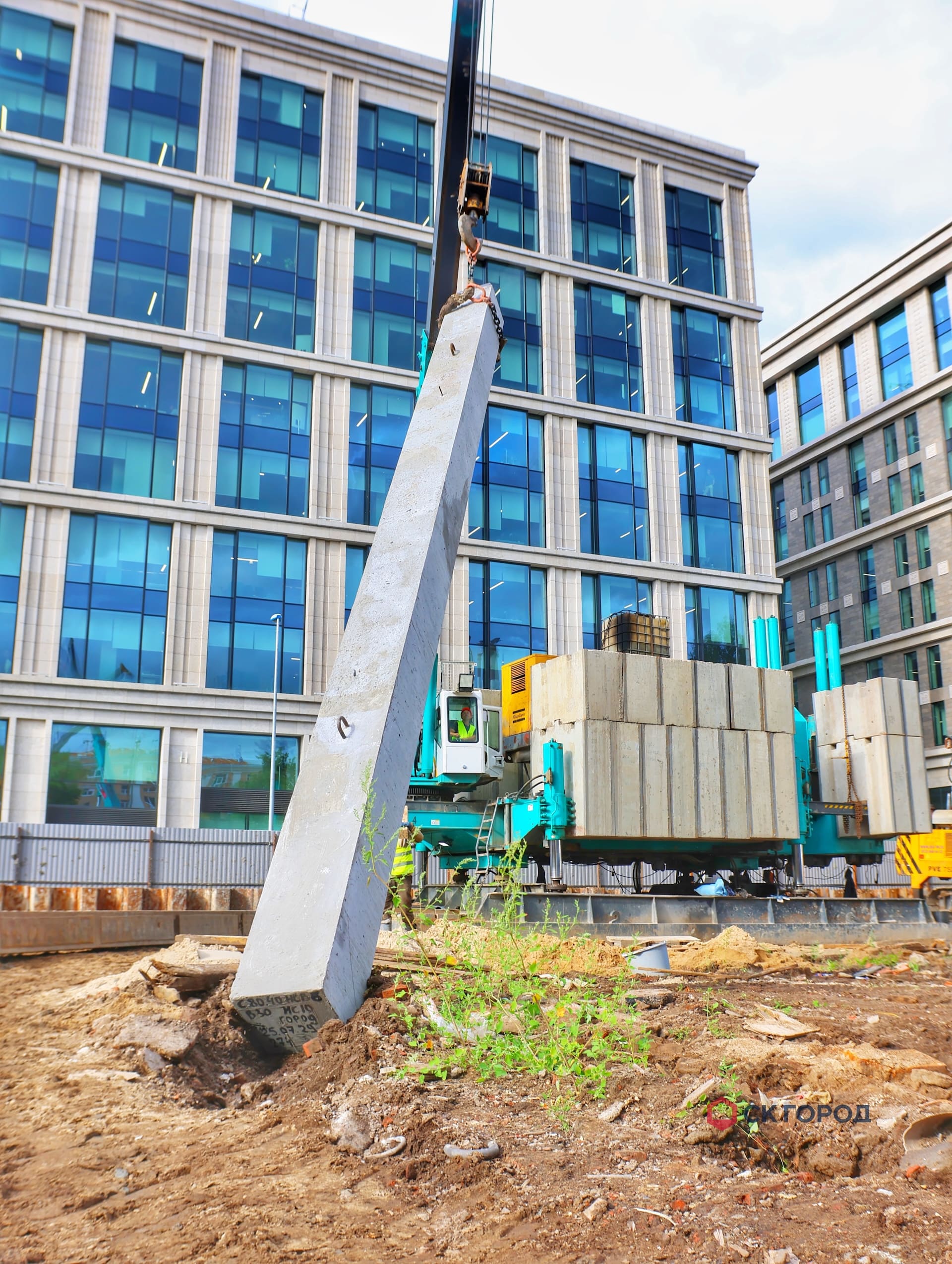 - Устройство шпунтового ограждения. Вдоль существующих зданий погружение выполнялось методом статического вдавливания с ограничением до трех шпунтовых свай в день. На остальных участках, после проведения успешных испытаний с мониторингом, применялось вибропогружение. Такая замена значительно сэкономила бюджет Заказчика. Работы велись с постоянным мониторингом окружающей застройки до полного их завершения.