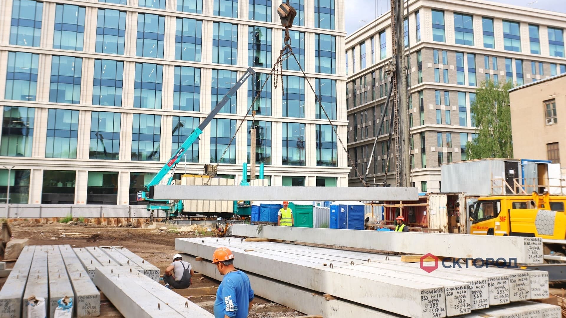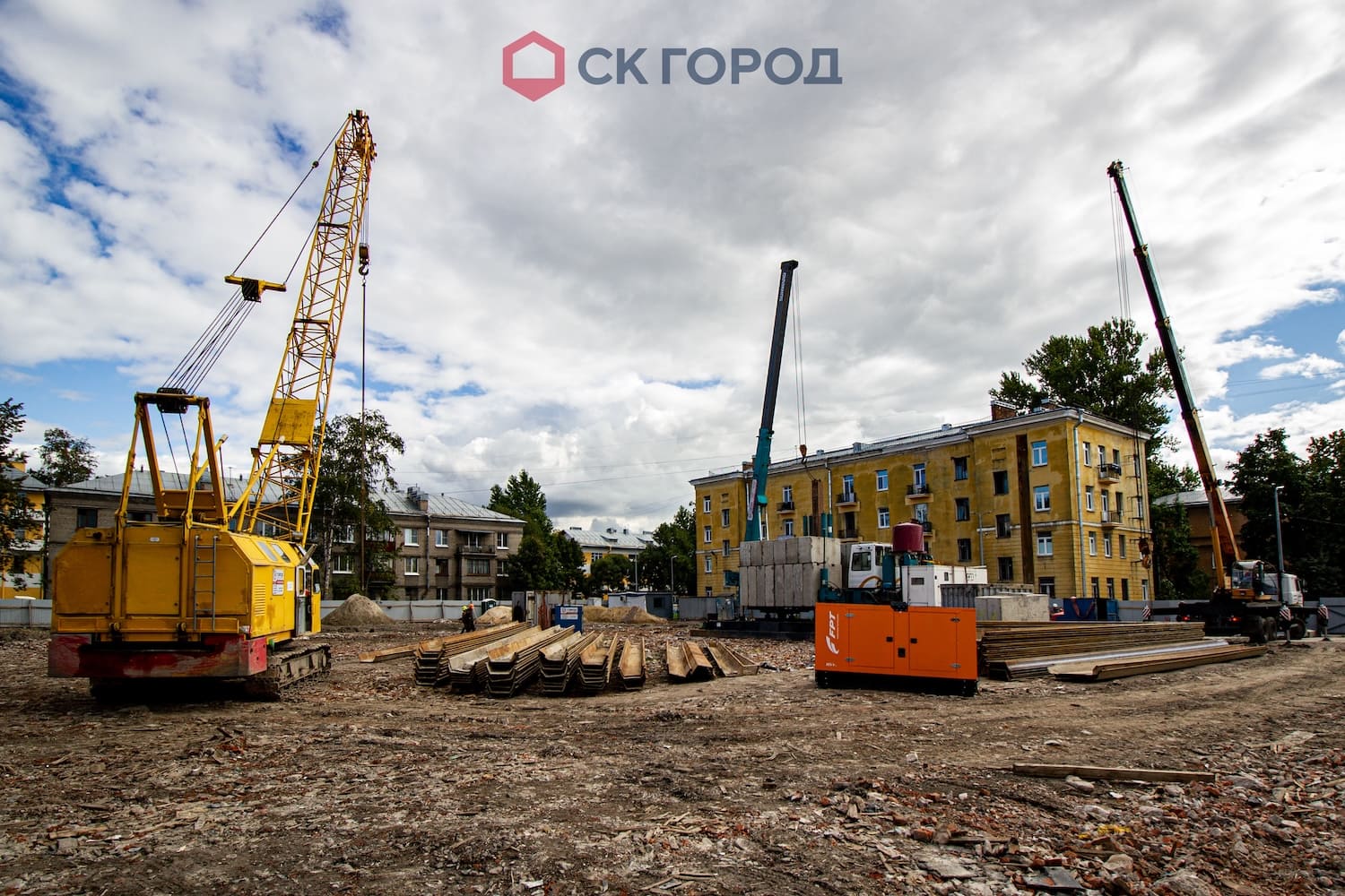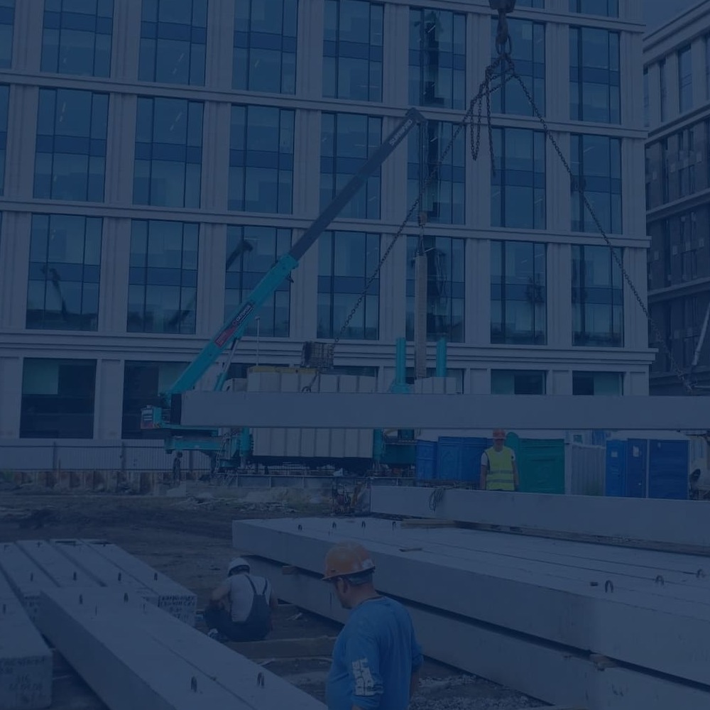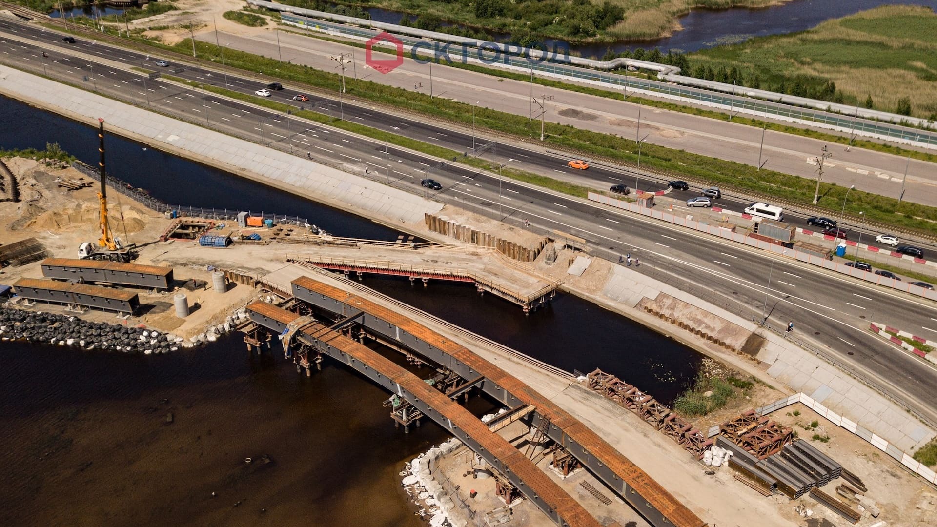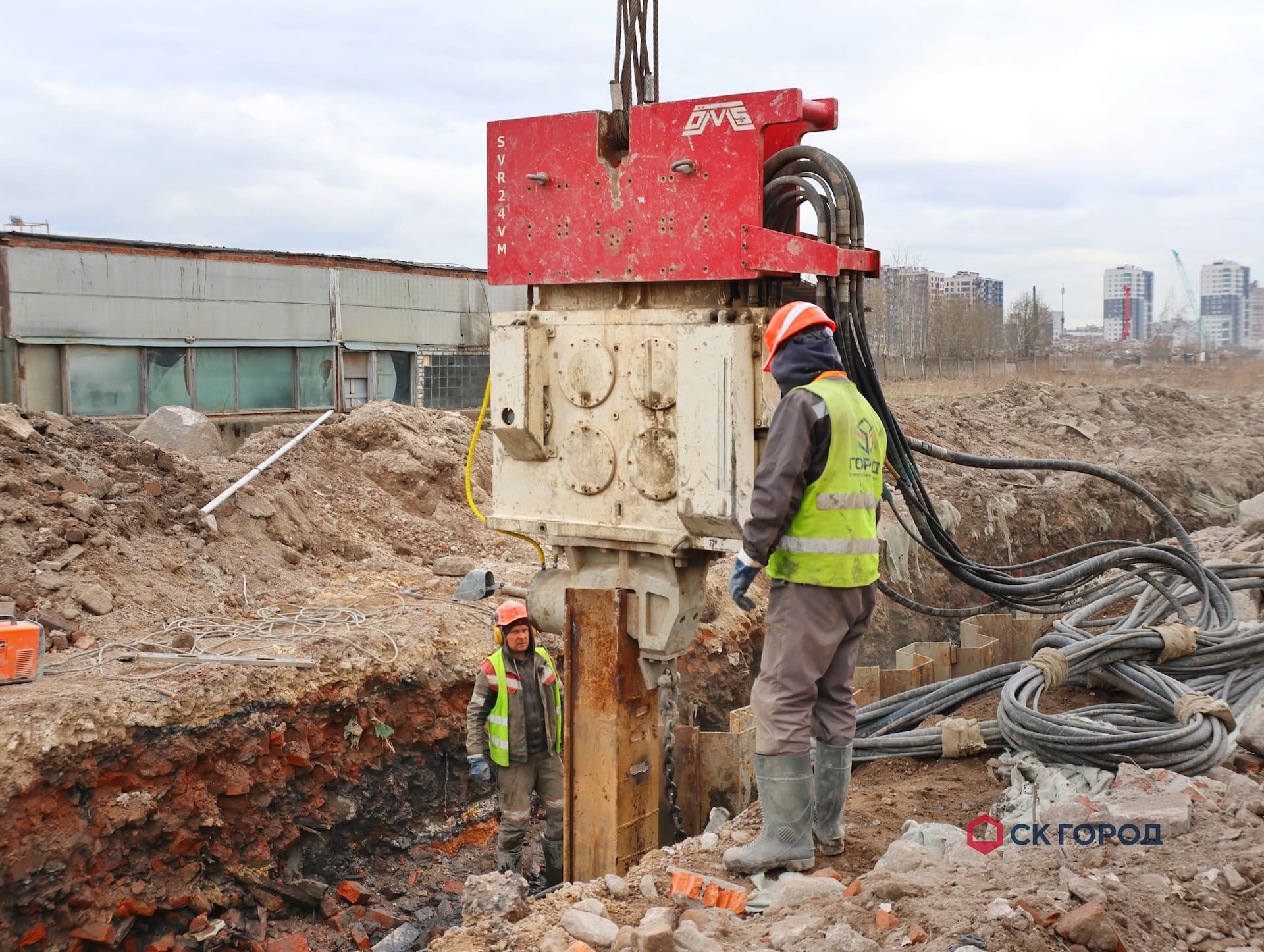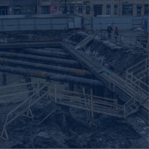 - Устройство шпунтового ограждения с системой крепления. На этапе начала производства работ отсутствовали временные дороги для проезда техники, которые организовали собственными силами. Геологические условия объекта требовали тщательного подбора техники - вибропогружатели с выскоими мощностными характеристиками. В процессе работ обнаружилось большое количество старых конструкций - препятствий в грунте, которые откапывали экскаватором и удаляли с оси погружения. Из-за высокого уровня грунтовых вод проводились мероприятия по откачке воды системой из нескольких помп.