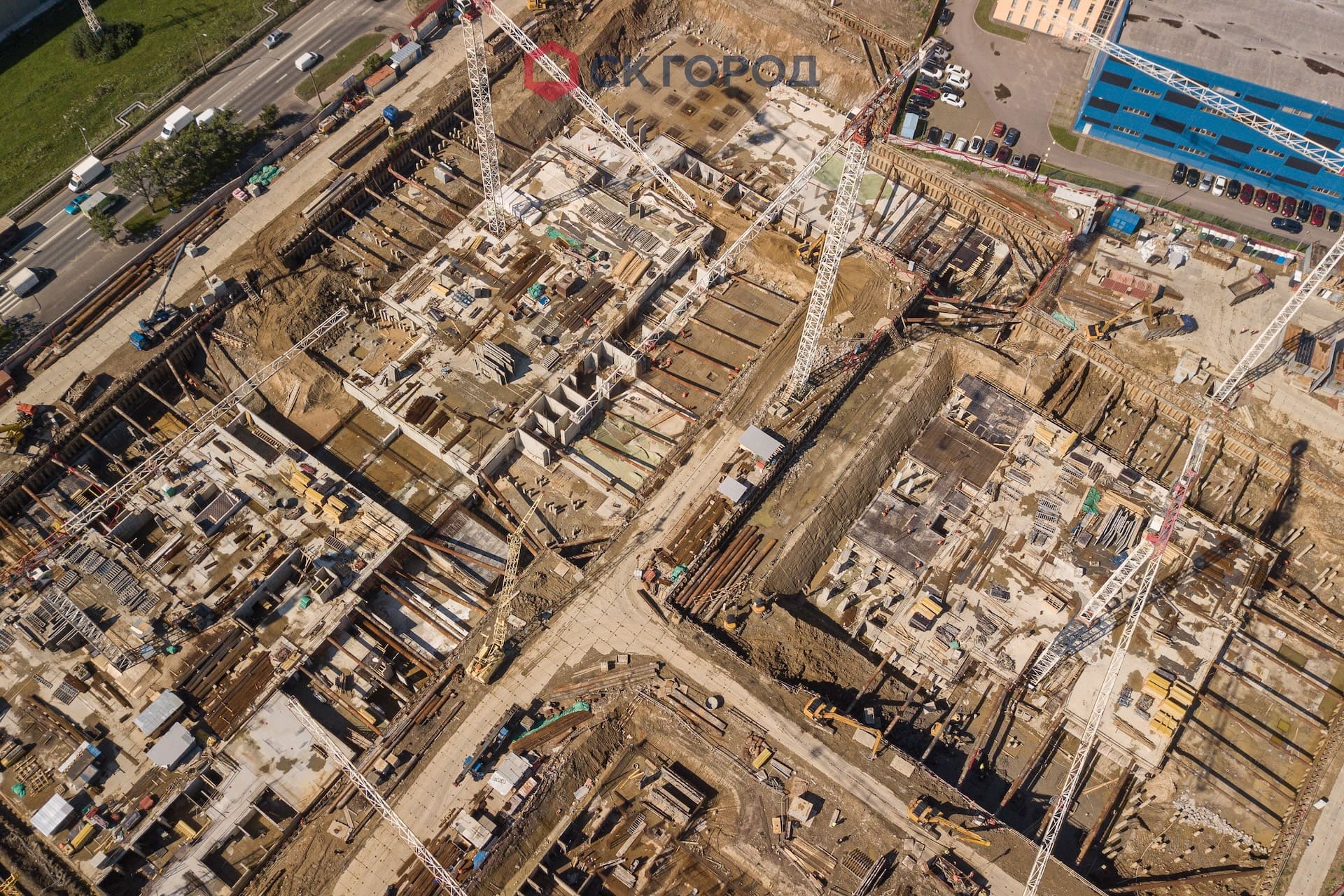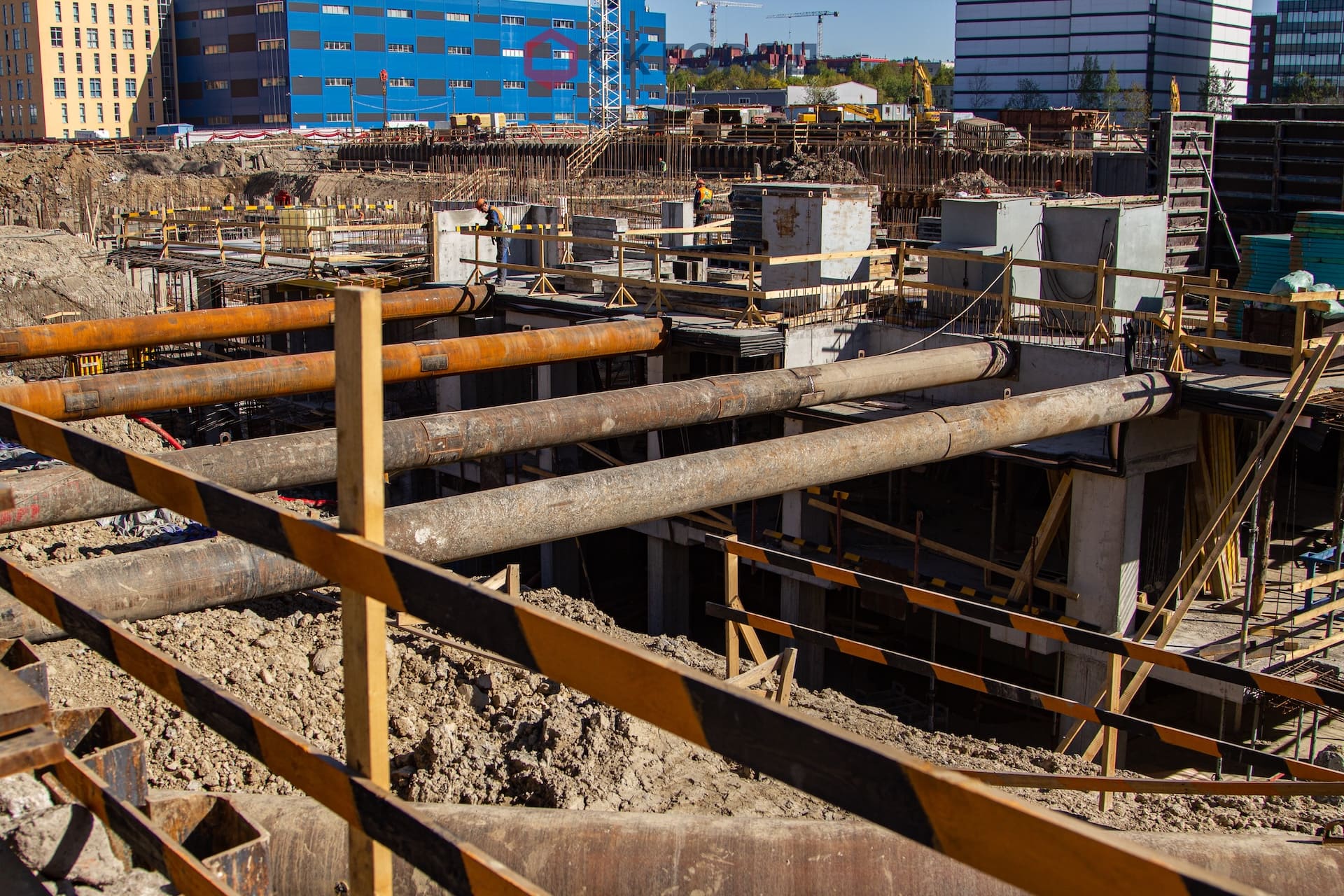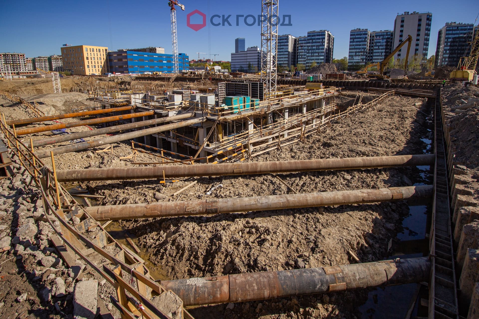 - Монтаж системы крепления и Земляные работы. При откопке котлована было обнаружено два бомбоубежища, которые удалось демонтировать сторонней организацией. Для обеспечения графика производства работ на объект выводилось до шести единиц техники единовременно. Из-за масштабности проекта и большого количества вводных условий на строительной площдке, с нашей стороны нередко инициировались оптимизации проектных решений в части системы крепления и земляных работ, которые успешно согласовывались и применялись.