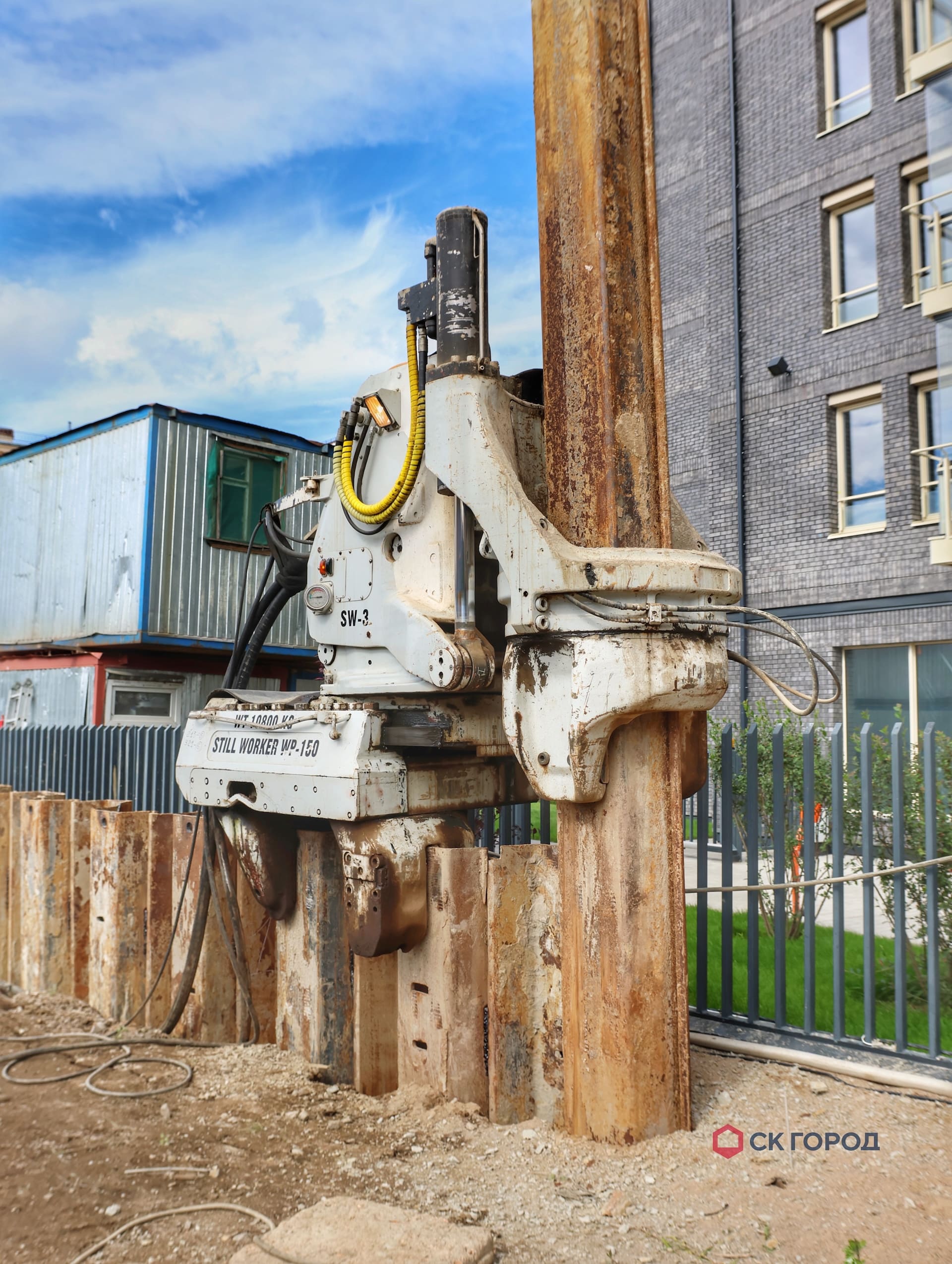 - В зоне близкого расположения к существующим зданиям применялся метод сатического вдавливания. Дополнительной мерой сохранения окружающей застройки стало применение лидерного бурения по оси погружения шпунта на 3 м для разуплотнения грунта, а также ограничение по количеству погружаемых свай - не более трех штук в день.