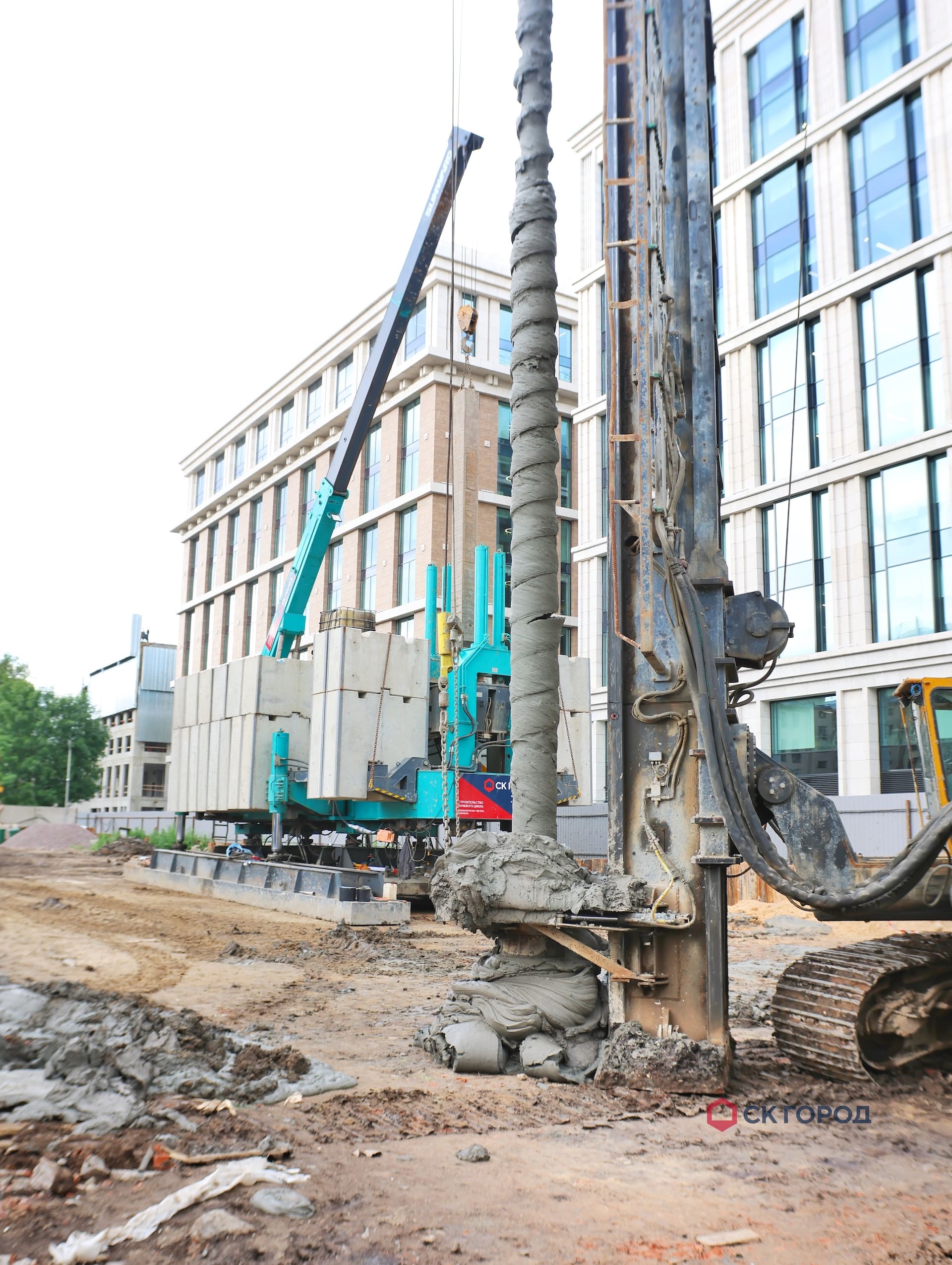 - Устройство шпунтового ограждения. Вдоль существующих зданий погружение выполнялось методом статического вдавливания с ограничением до трех шпунтовых свай в день. На остальных участках, после проведения успешных испытаний с мониторингом, применялось вибропогружение. Такая замена значительно сэкономила бюджет Заказчика. Работы велись с постоянным мониторингом окружающей застройки до полного их завершения.