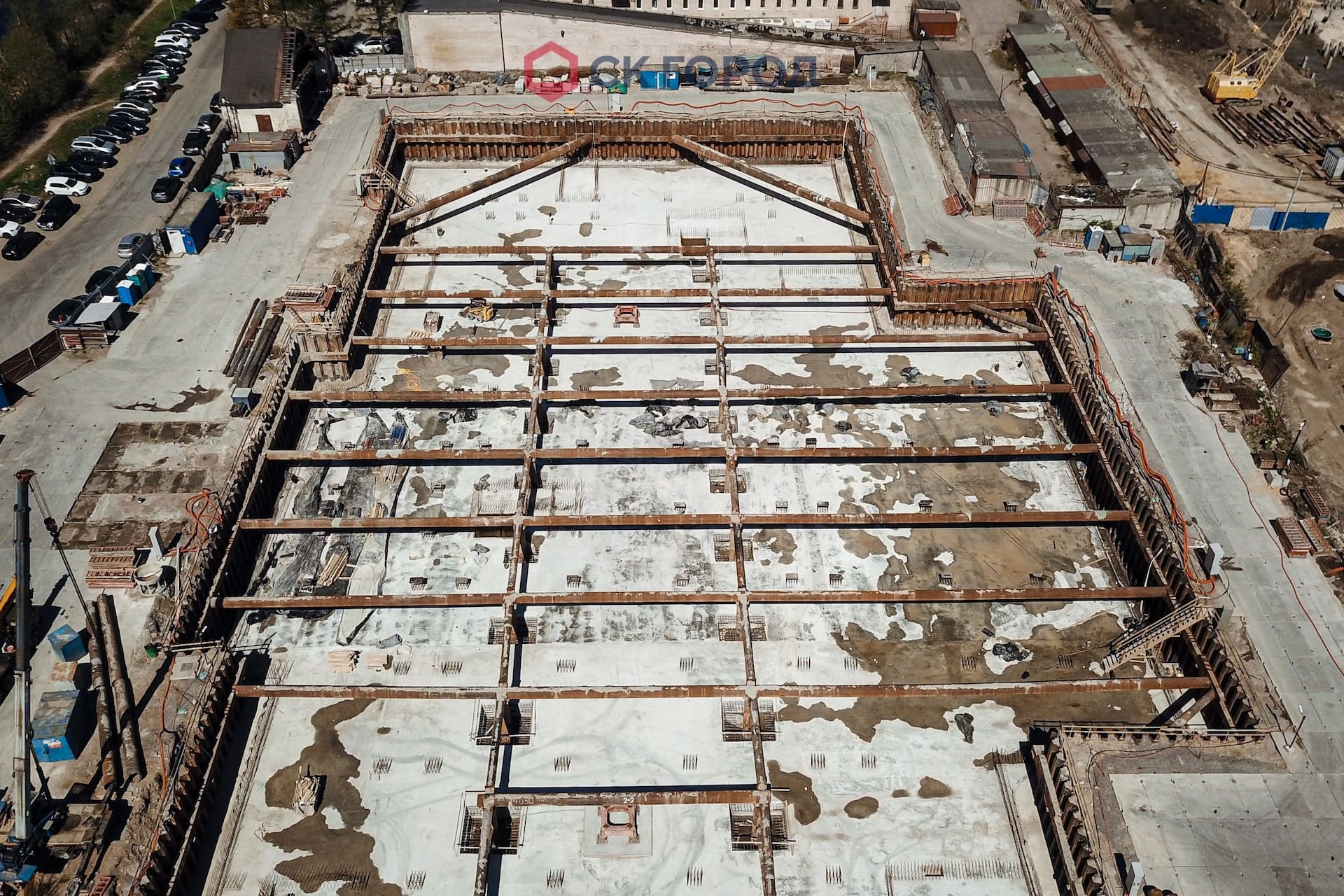- Вибропогружение шпунтового ограждения и устройство системы крепления. Поставки шпунта подстраивались под внешние факторы - узкий въезд на объект и припаркованные автомобили работников соседнего предприятия затрудняли проезд длинномерного транспорта со шпунтом. Завоз осуществлялся в утренние часы до 8 или в ночное время.