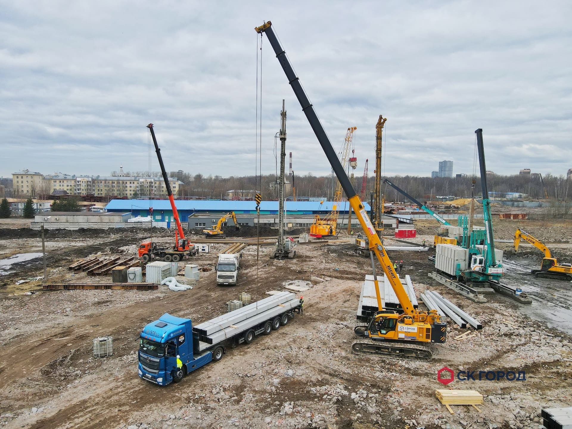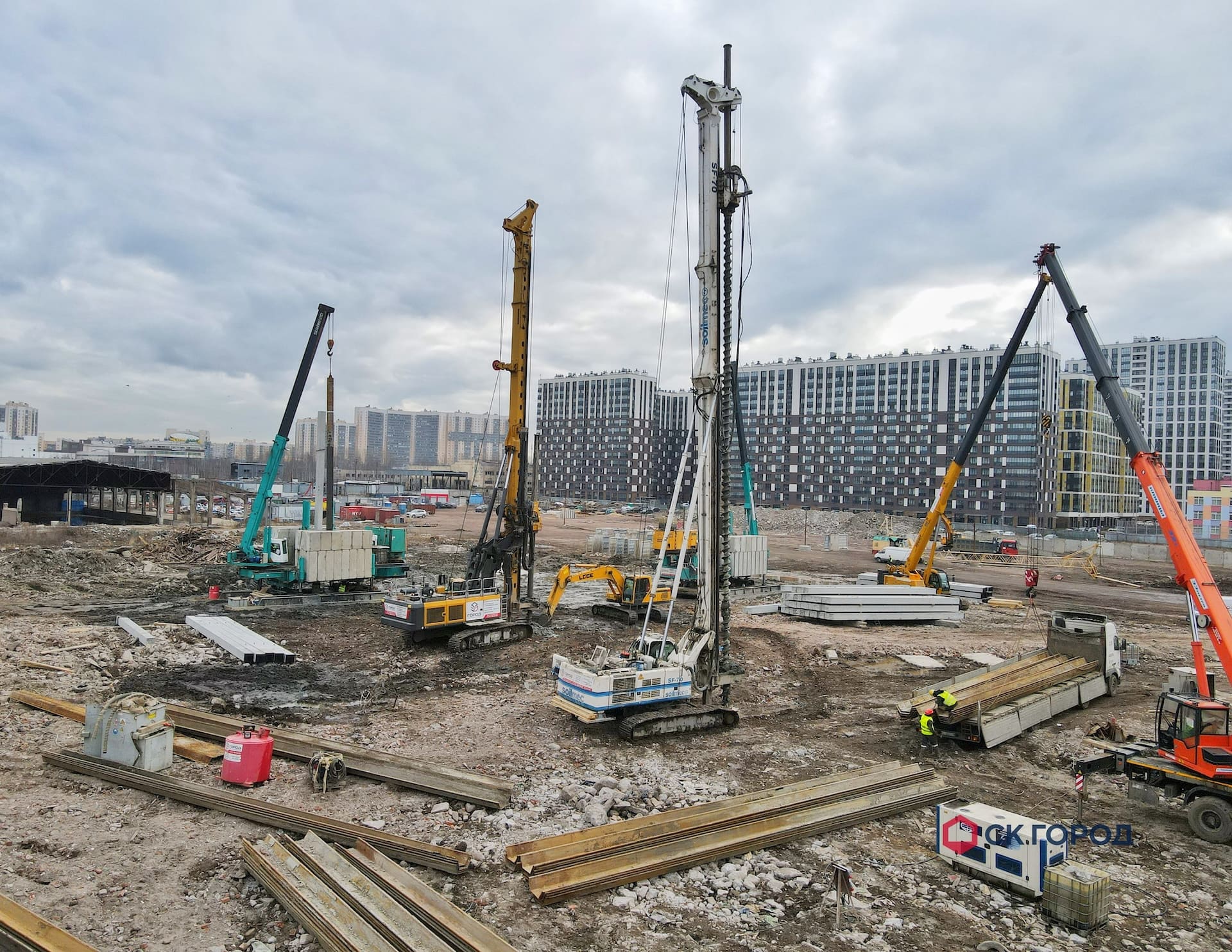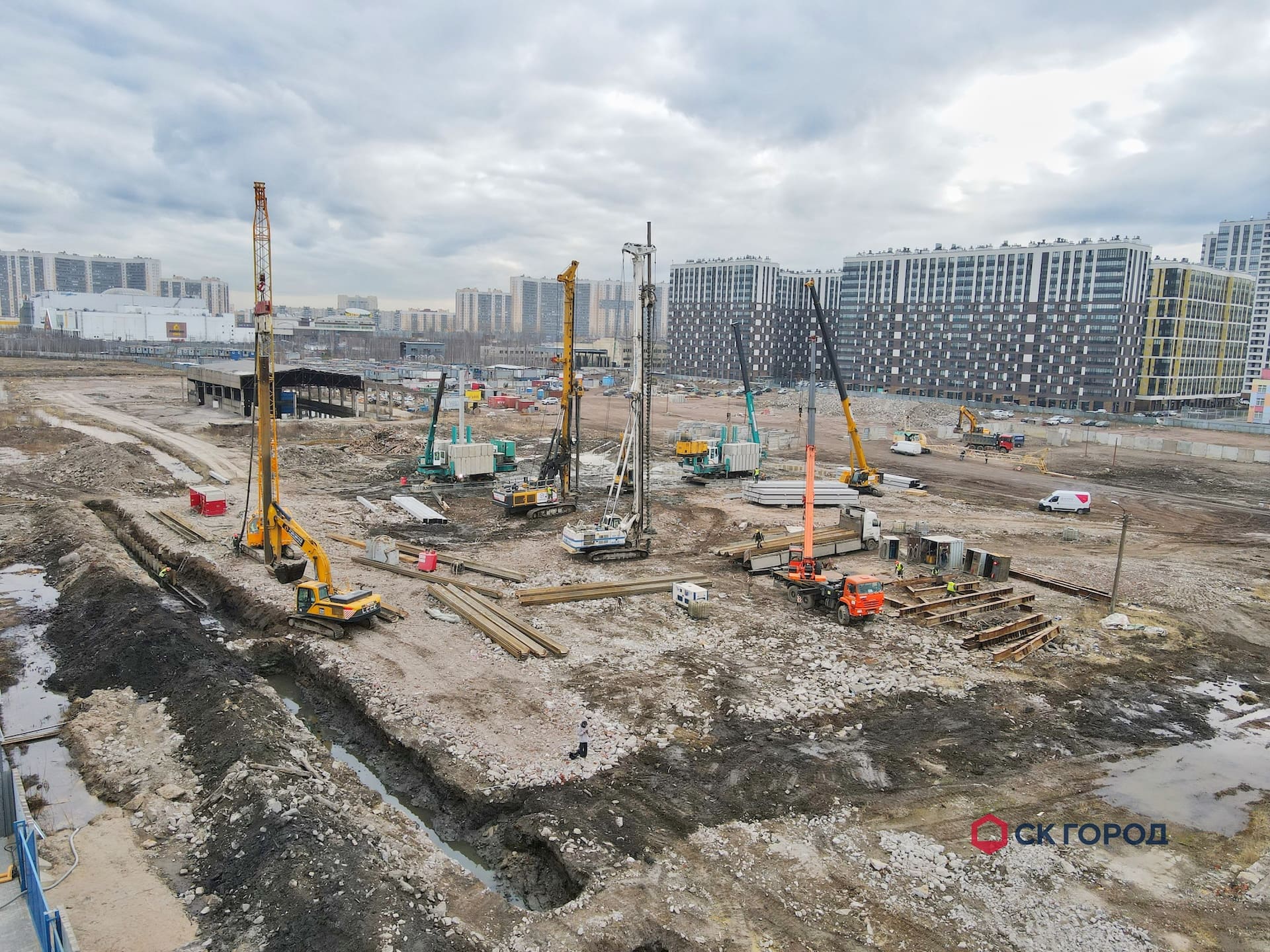Выполнен комплекс работ по устройству свайного основания и шпунтового ограждения. Также выполнен дополнительный комплекс работ, обусловленный особенностями геологии - удаление препятствий и осушение котлована.