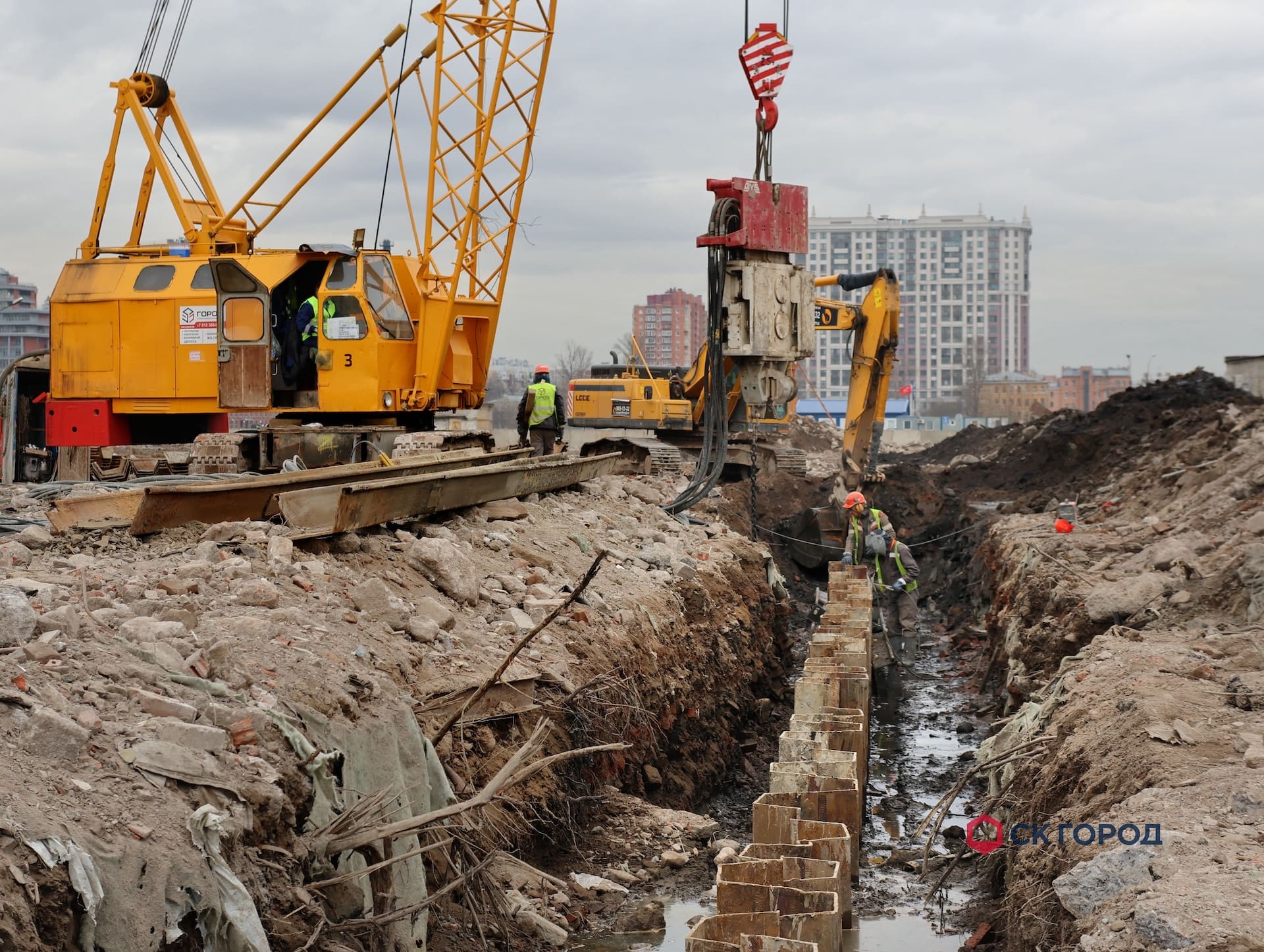 - Устройство шпунтового ограждения с системой крепления. На этапе начала производства работ отсутствовали временные дороги для проезда техники, которые организовали собственными силами. Геологические условия объекта требовали тщательного подбора техники - вибропогружатели с выскоими мощностными характеристиками. В процессе работ обнаружилось большое количество старых конструкций - препятствий в грунте, которые откапывали экскаватором и удаляли с оси погружения. Из-за высокого уровня грунтовых вод проводились мероприятия по откачке воды системой из нескольких помп.