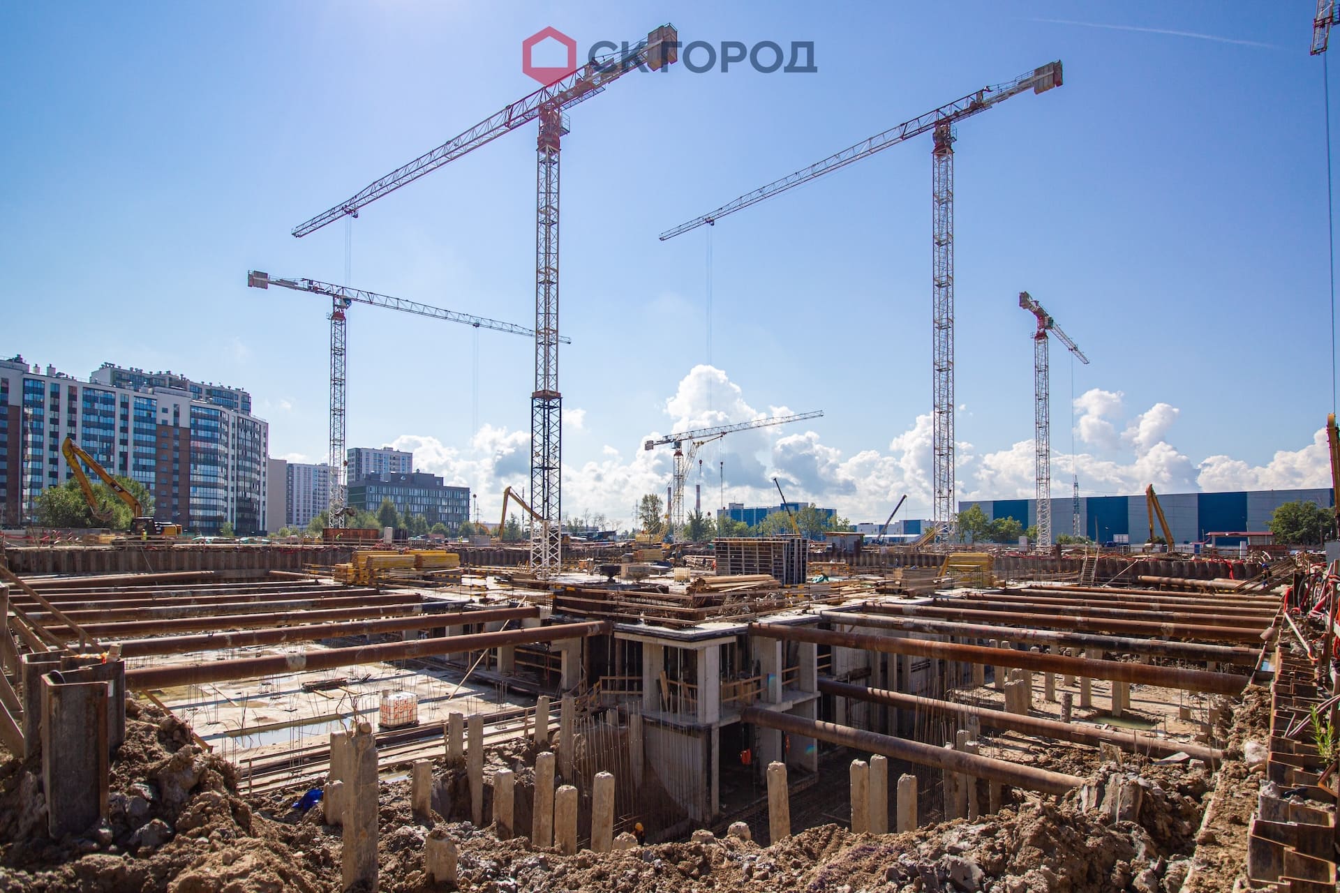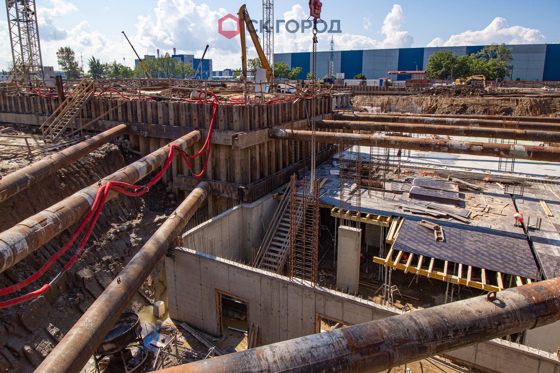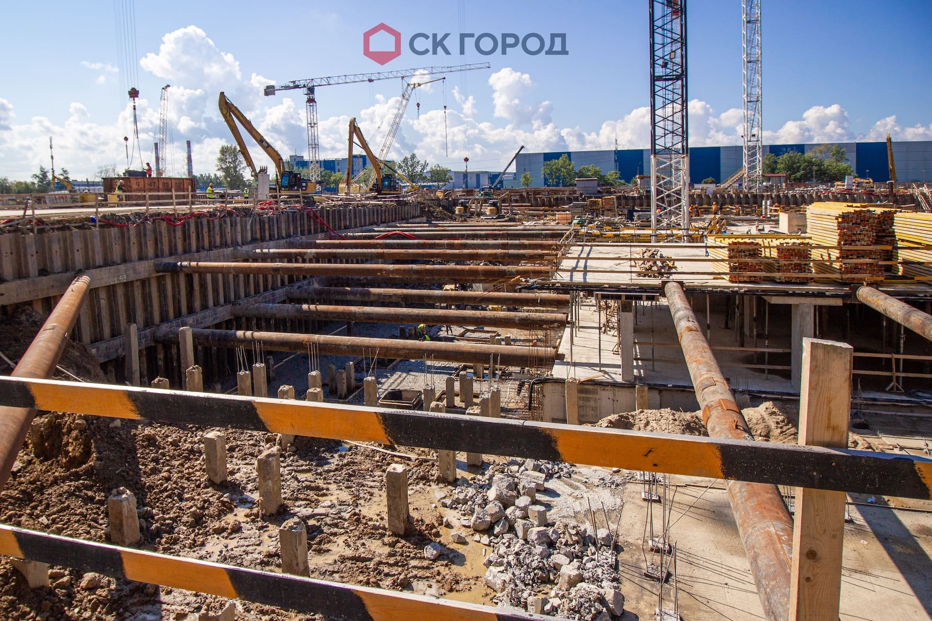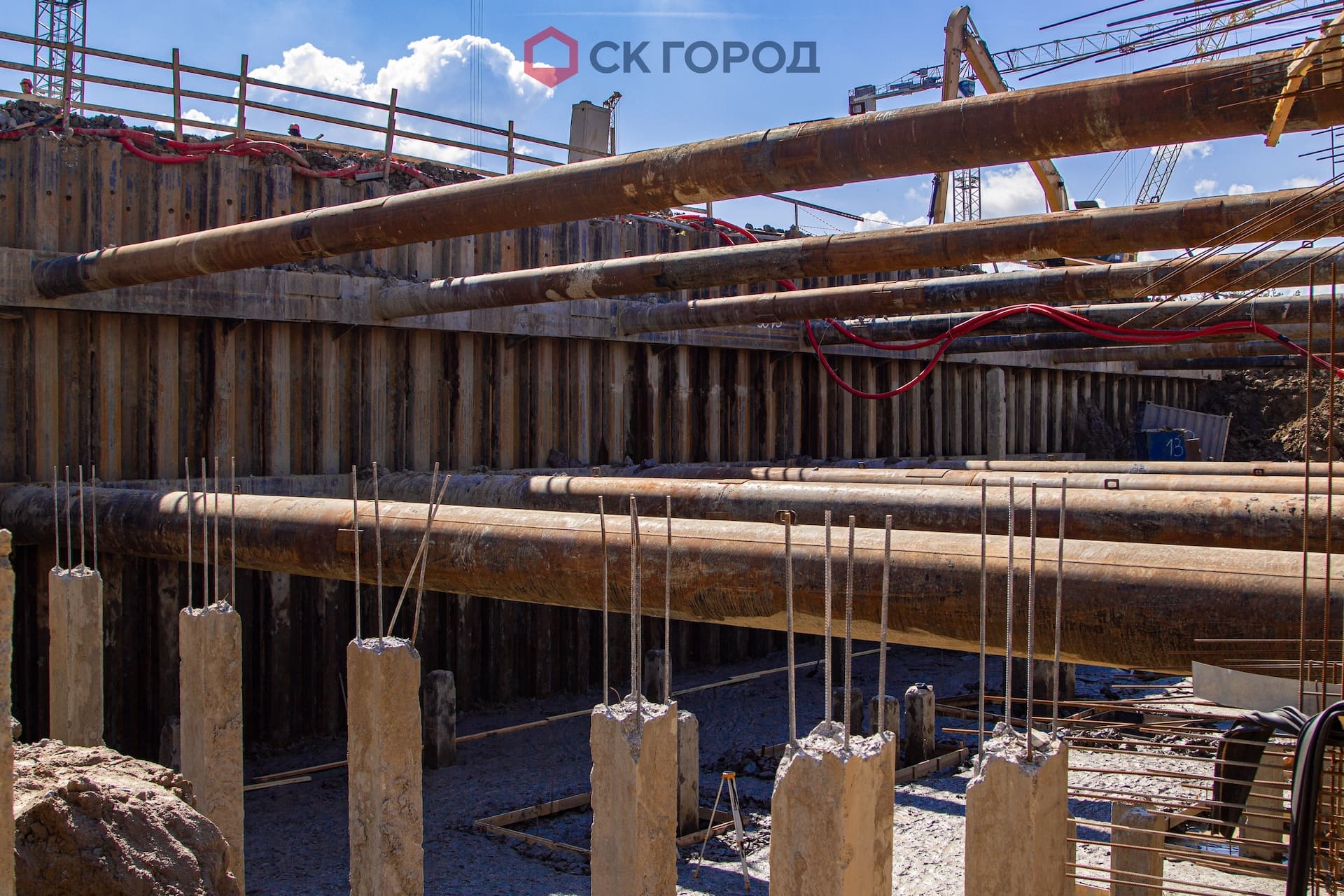 - Монтаж системы крепления и Земляные работы. При откопке котлована было обнаружено два бомбоубежища, которые удалось демонтировать сторонней организацией. Для обеспечения графика производства работ на объект выводилось до шести единиц техники единовременно. Из-за масштабности проекта и большого количества вводных условий на строительной площдке, с нашей стороны нередко инициировались оптимизации проектных решений в части системы крепления и земляных работ, которые успешно согласовывались и применялись.