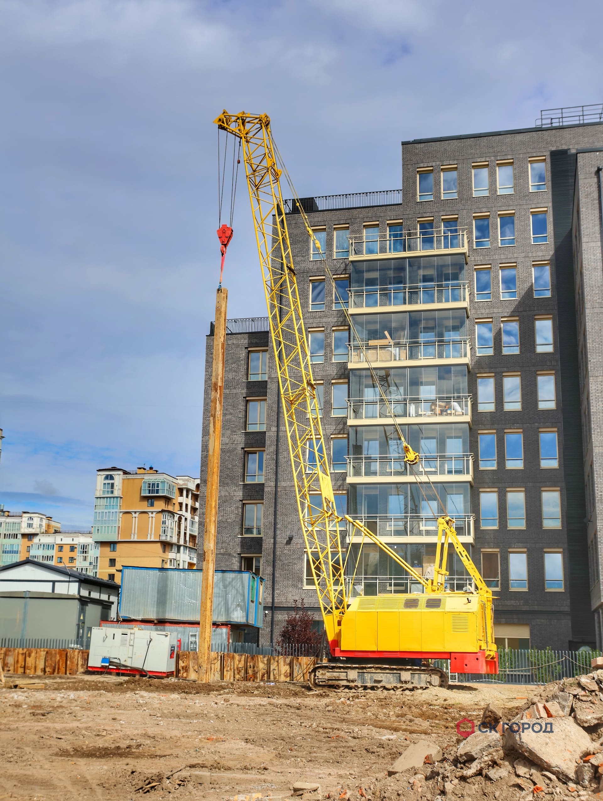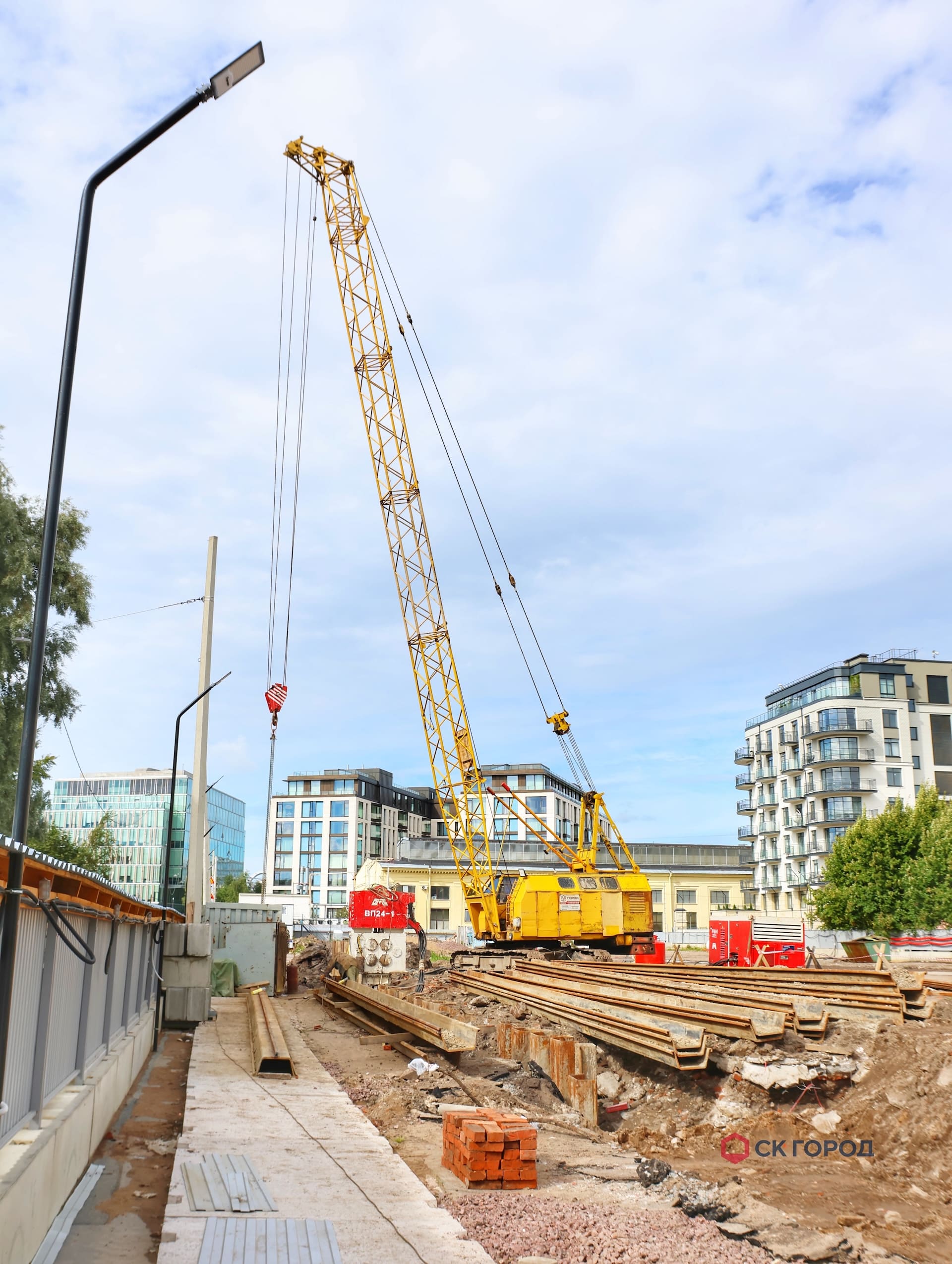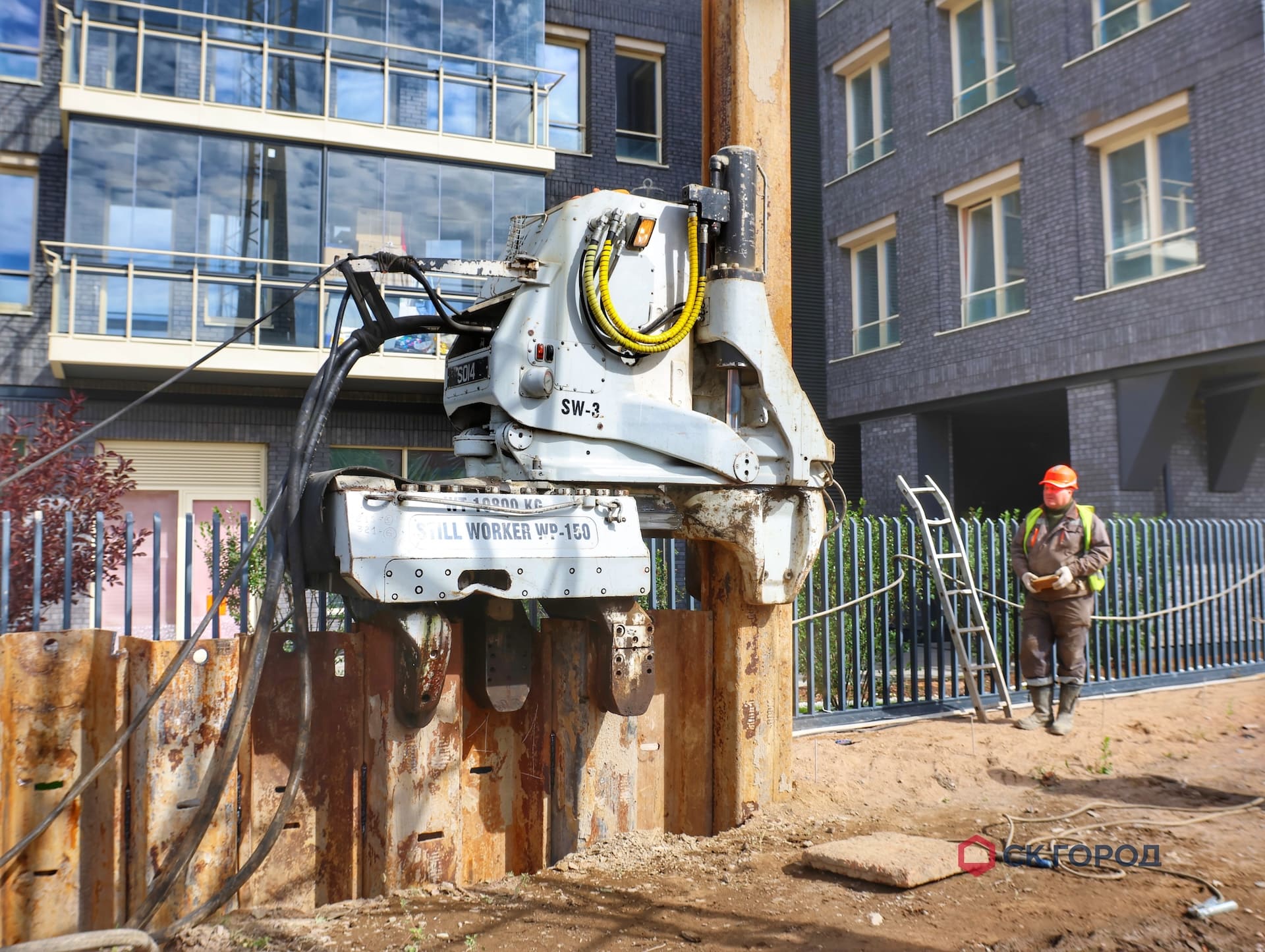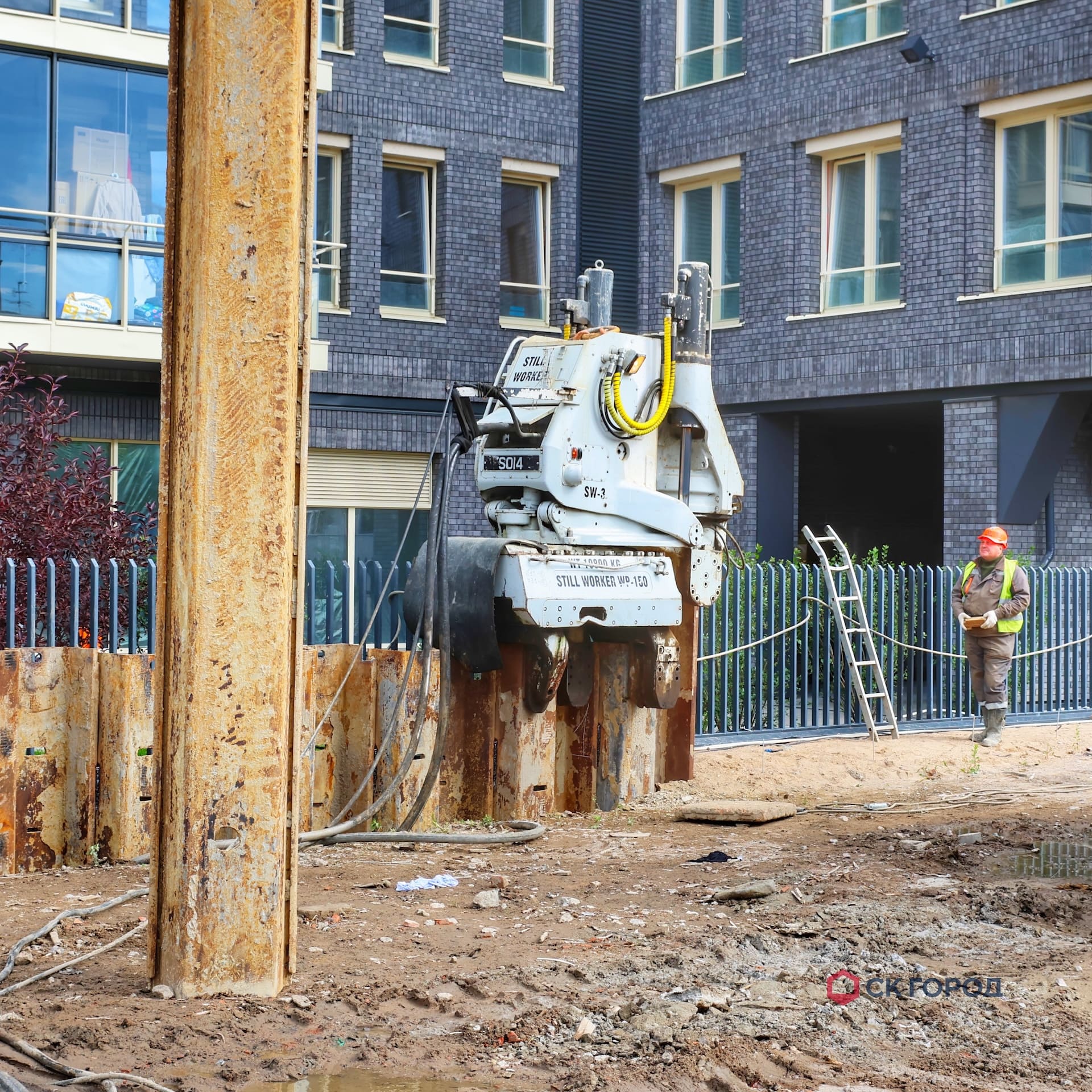 - В зоне близкого расположения к существующим зданиям применялся метод сатического вдавливания. Дополнительной мерой сохранения окружающей застройки стало применение лидерного бурения по оси погружения шпунта на 3 м для разуплотнения грунта, а также ограничение по количеству погружаемых свай - не более трех штук в день.